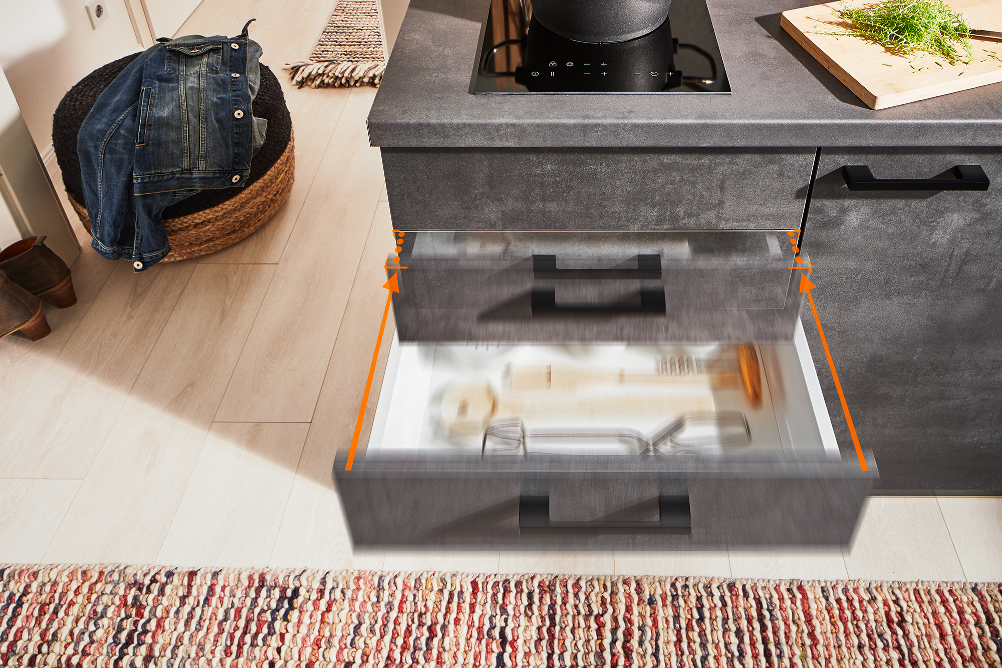 Made in Germany, hochwertig kratz- und abriebfest, Fronten und Korpus beidseitig melaminbeschichtet, besonders hohe Belastbarkeit der Sichtkanten, besonders stabile Qualitäts-Beschläge von Blum, praktischer Vollauszug, geräuscharmer Lauf mit Softclose-Technik, selbstschließende Türscharniere mit 107° Öffnungswinkel für den bequemen Zugang zum Stauraum.