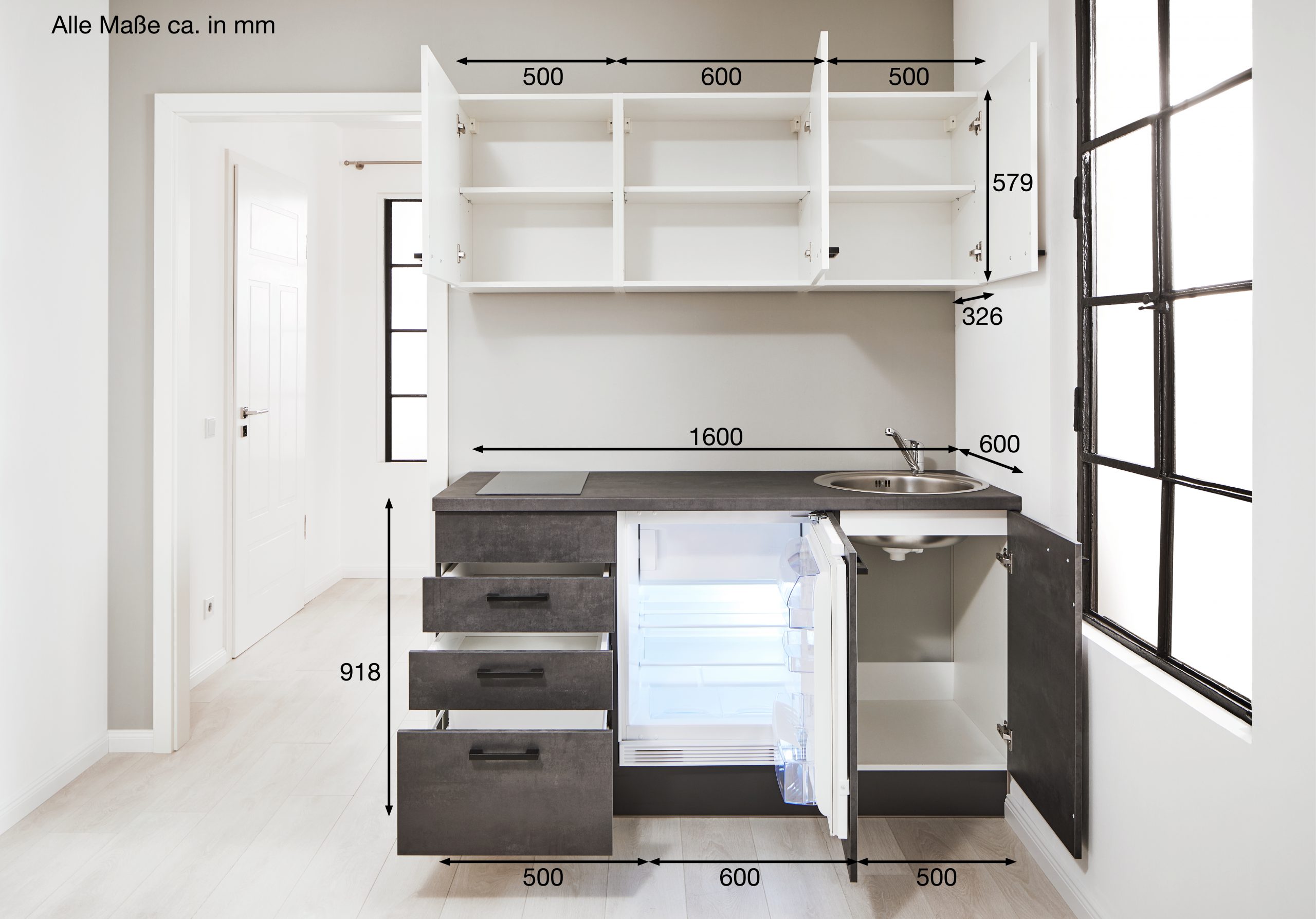 Zanker-Einbaugeräte: Kühlschrank, Glaskeramik-Kochfeld, Spüle + Armatur, Arbeitsplattenausschnitte für Spüle und Kochfeld.