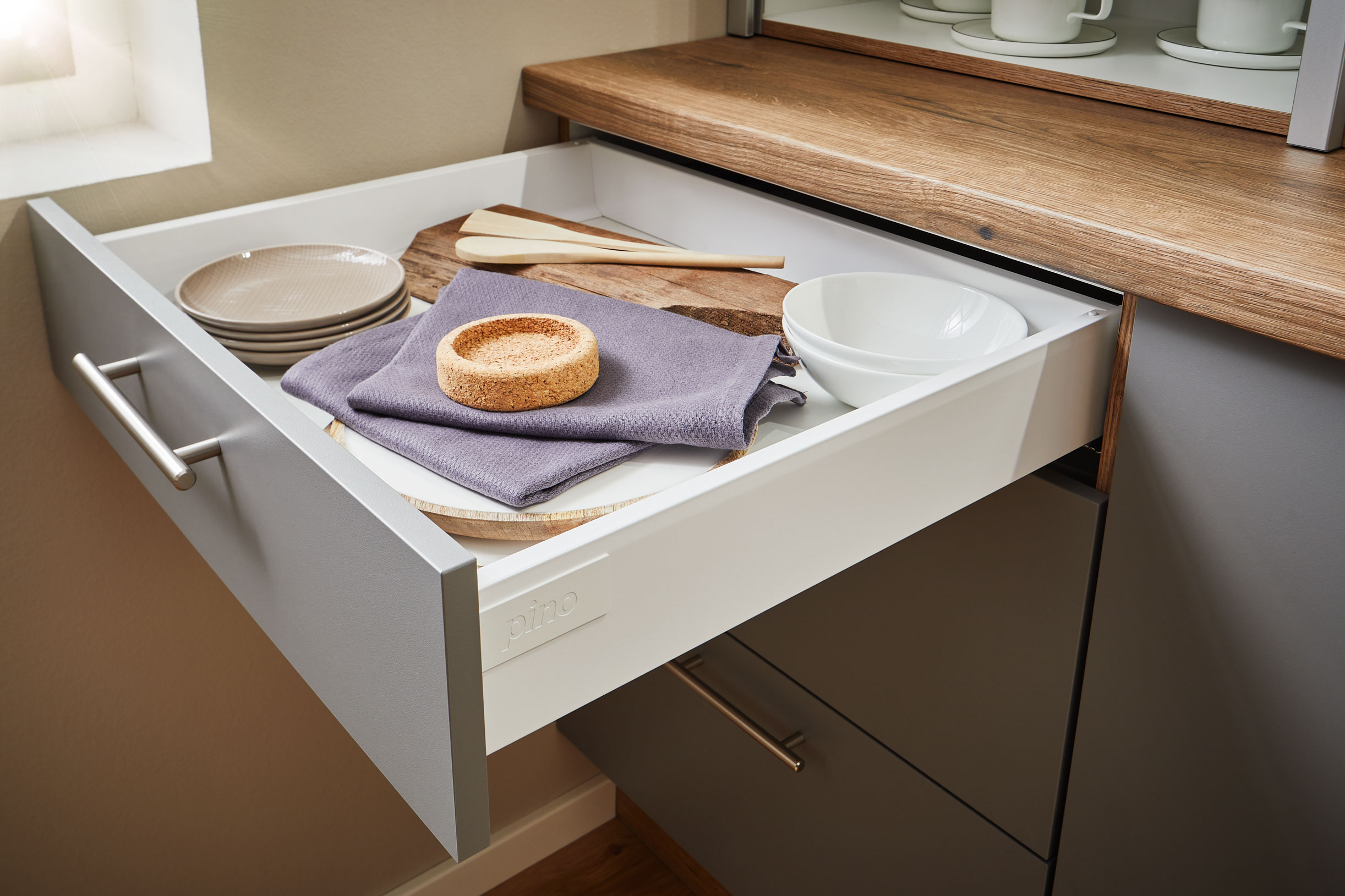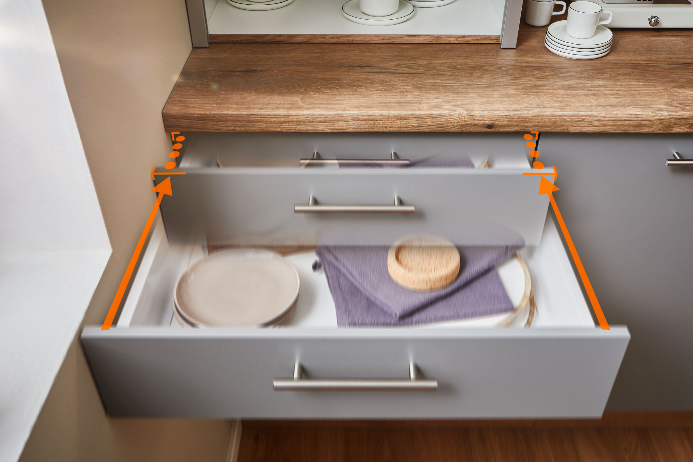 Made in Germany, hochwertig kratz- und abriebfest, Fronten und Korpus beidseitig melaminbeschichtet, besonders hohe Belastbarkeit der Sichtkanten, besonders stabile Qualitäts-Beschläge von Blum, praktischer Vollauszug, geräuscharmer Lauf mit Softclose-Technik, selbstschließende Türscharniere mit 107° Öffnungswinkel für den bequemen Zugang zum Stauraum.