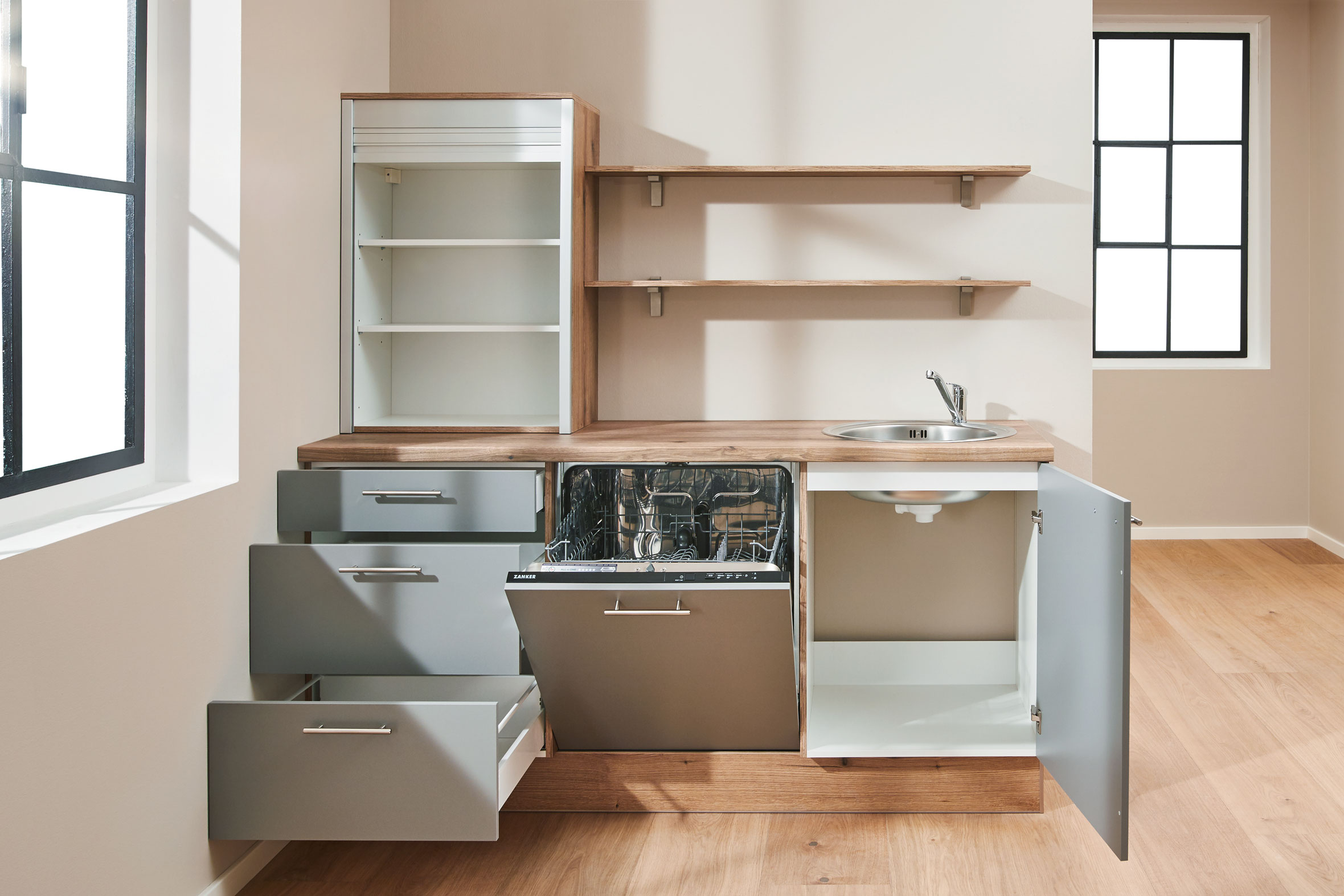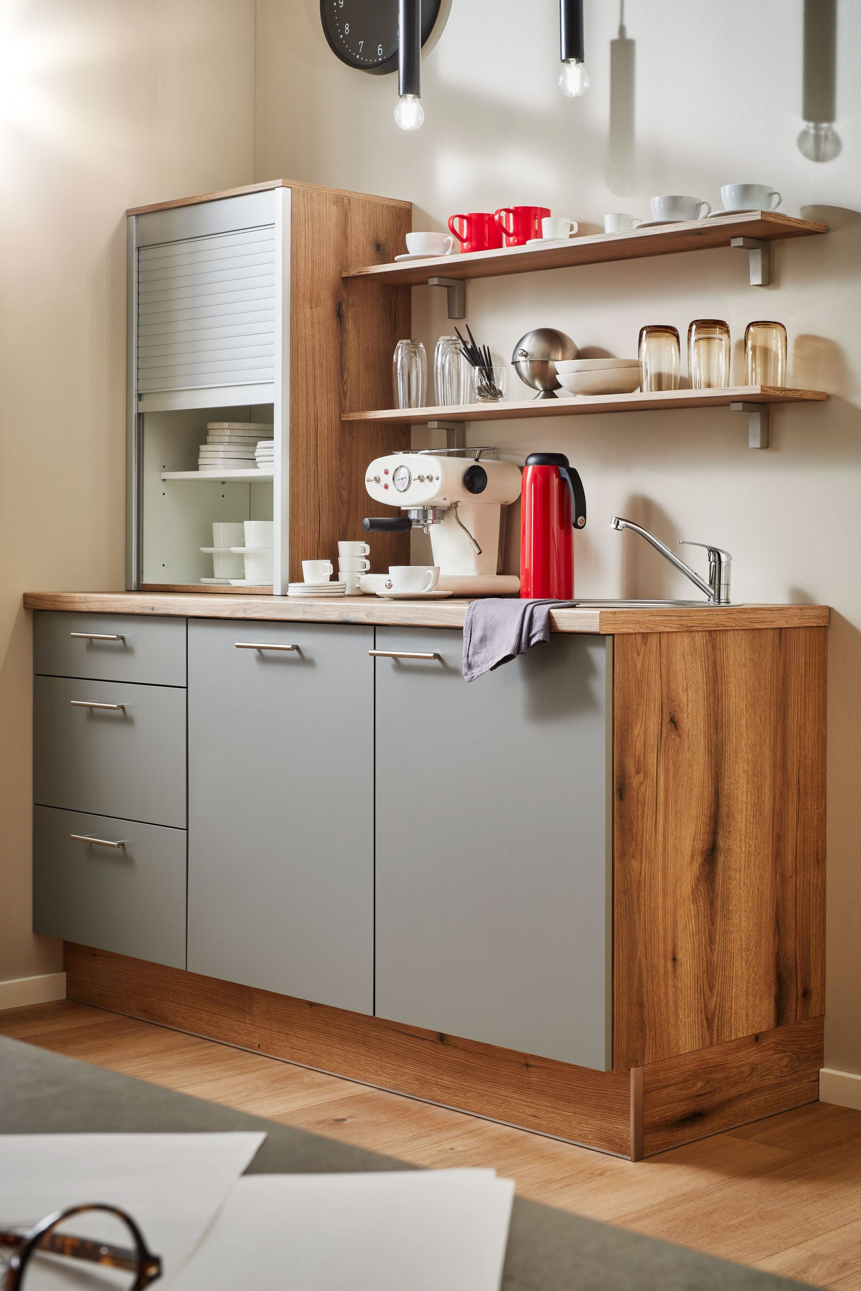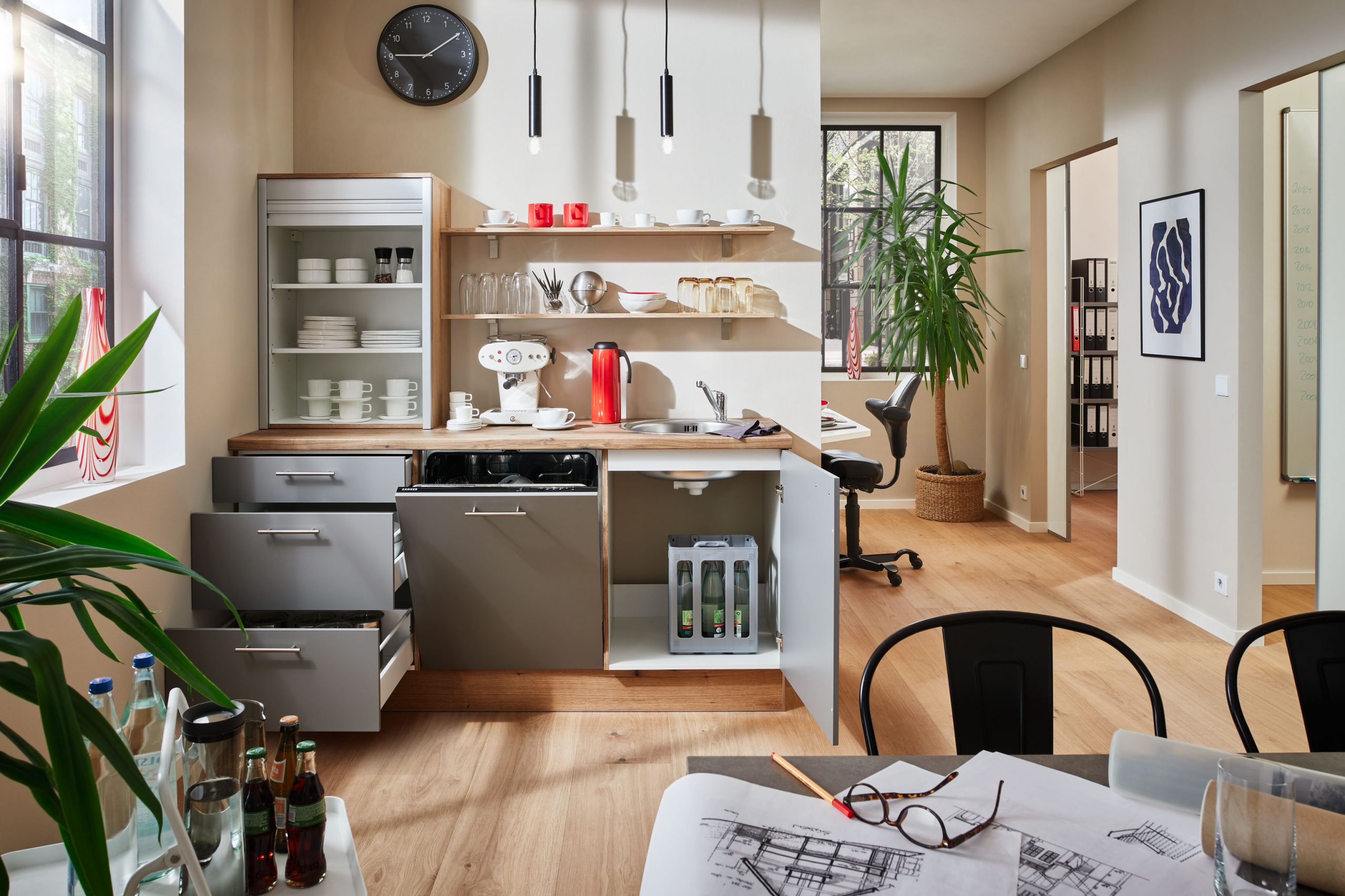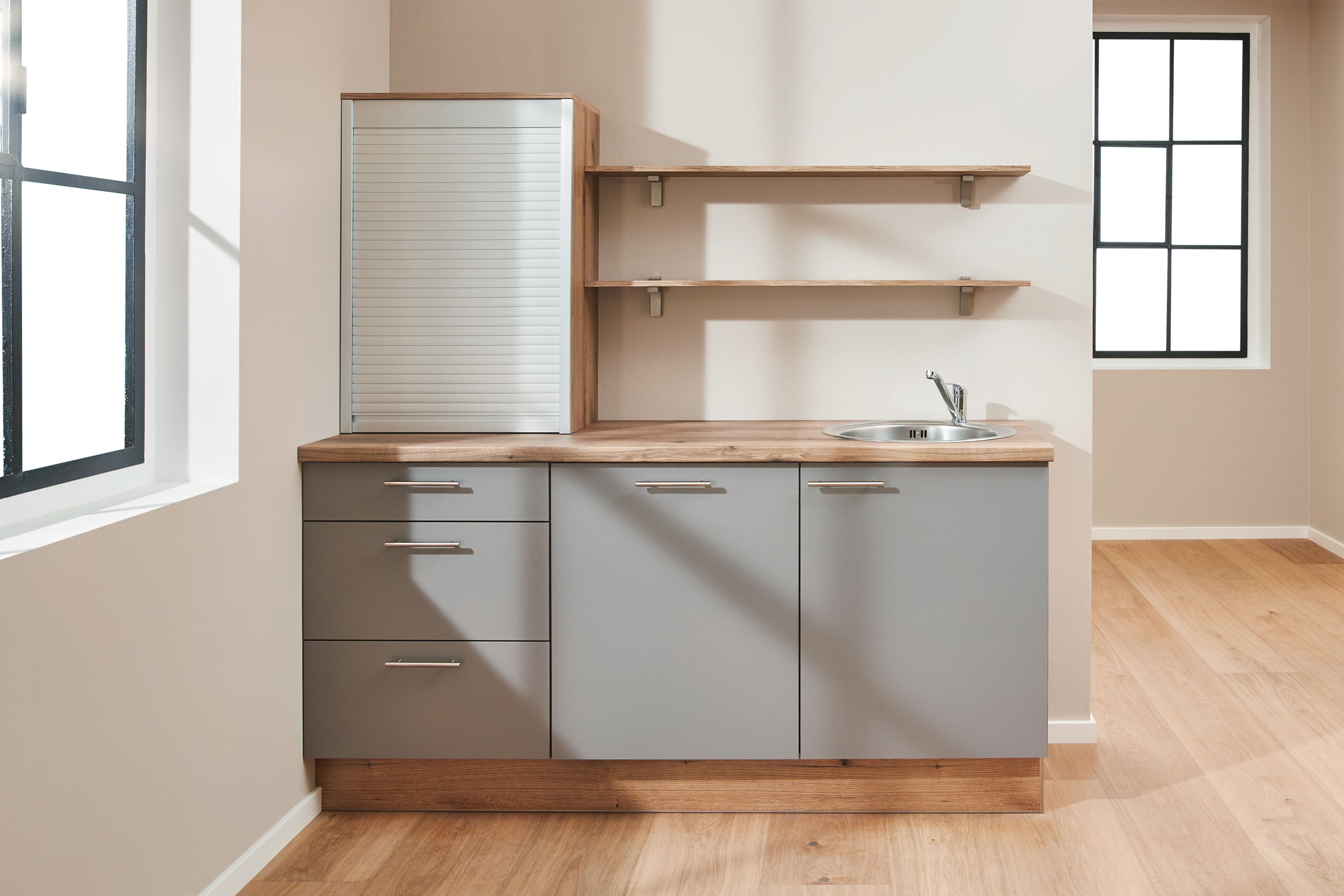 “Die neue Kaffeeküche in unserem Architekturbüro sollte vor allem praktisch und übersichtlich sein, die online küche bietete uns die ideale Lösung für uns. Dank des Rolladenschranks ist das Geschirr mit wenigen Griffen verstaut und außer Sichtweite, die Küche sieht also trotz des Büroalltags immer ordentlich aus.” – Moritz (32)
