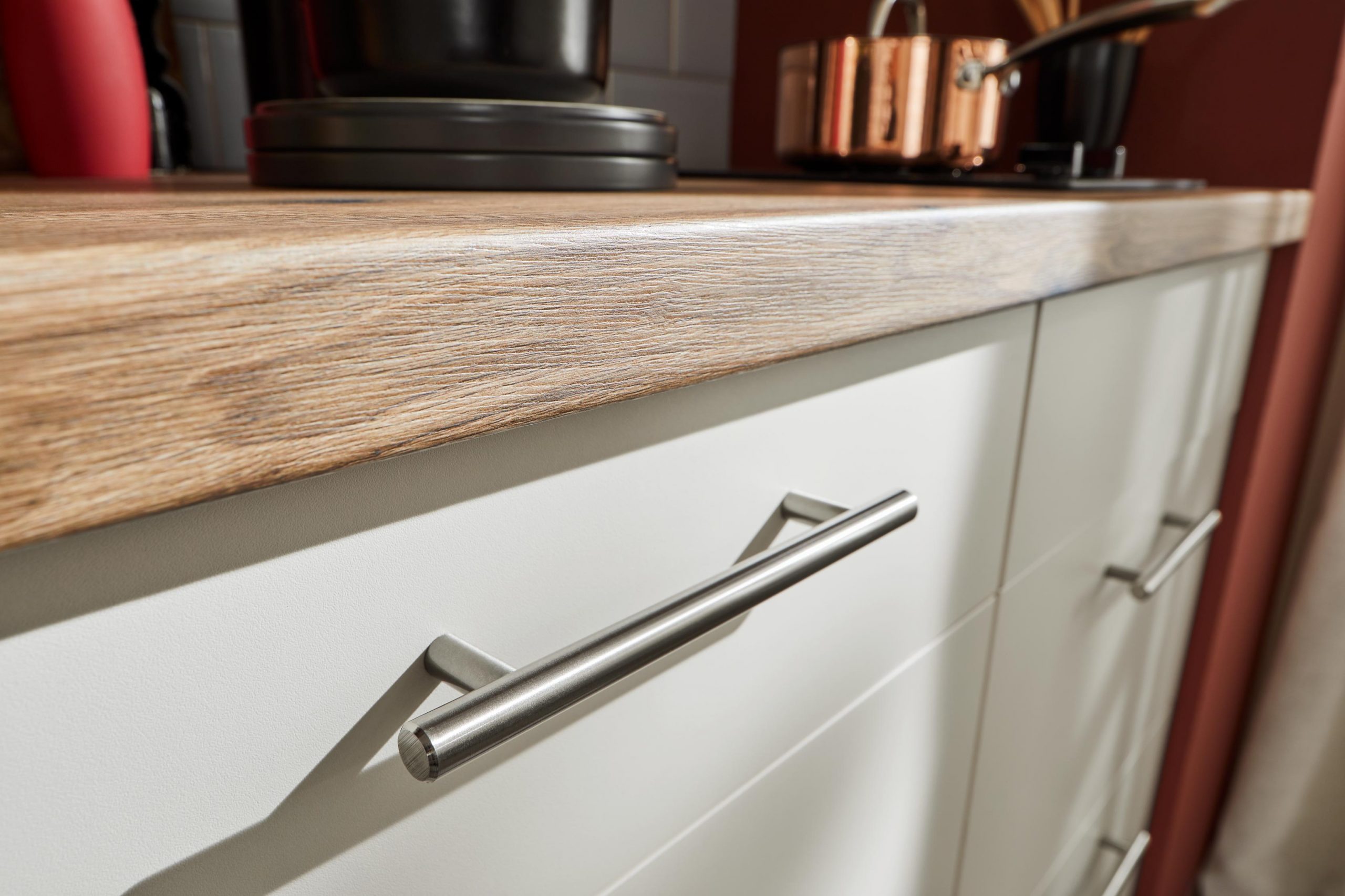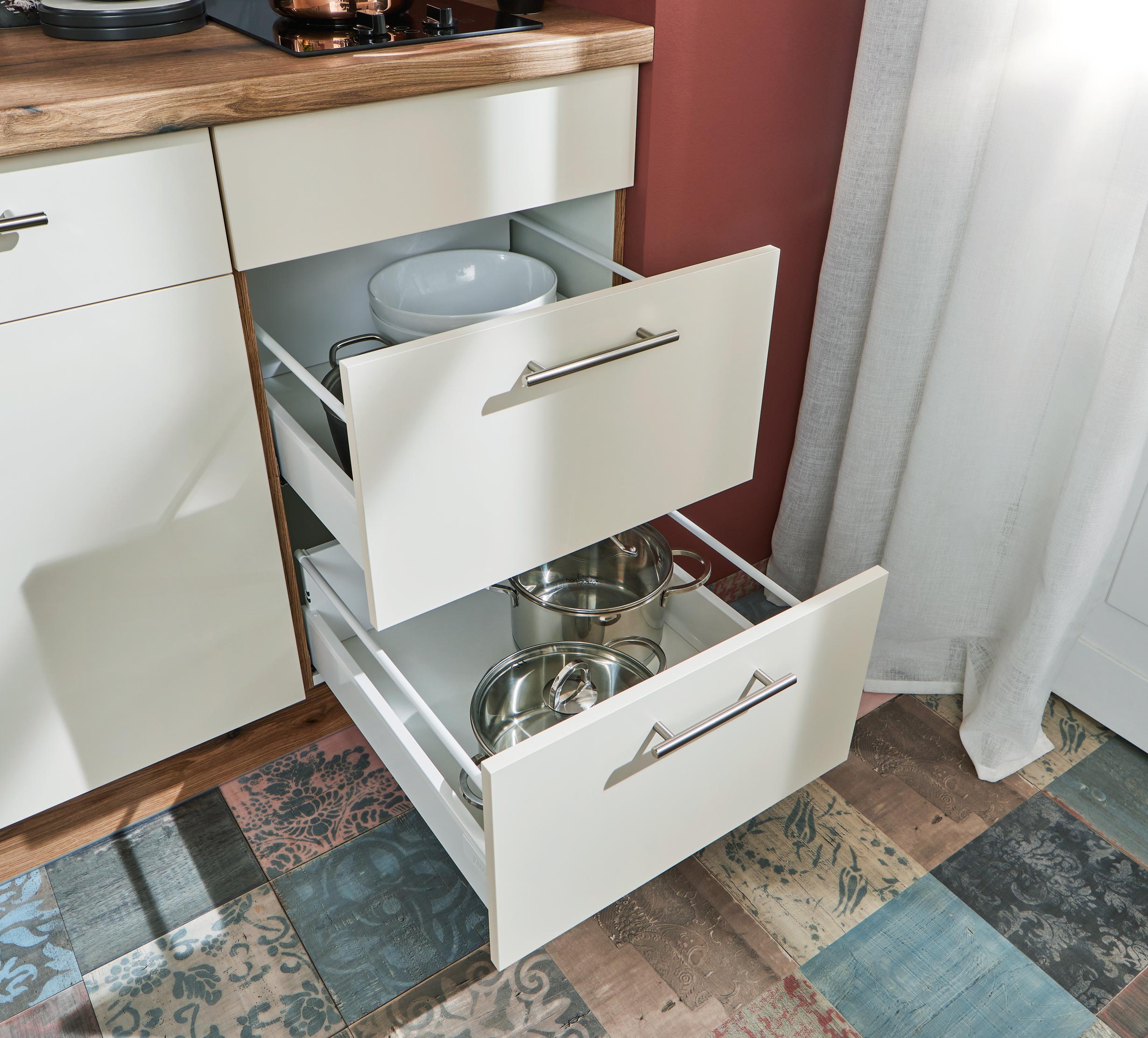 Höhenverstellbare Sockelfüße ermöglichen ein perfektes Ausrichten der Küchen, die Sockelblende mit aufsteckbarem Dichtungsprofil verhindert das Eindringen von Wasser und Schmutz.
