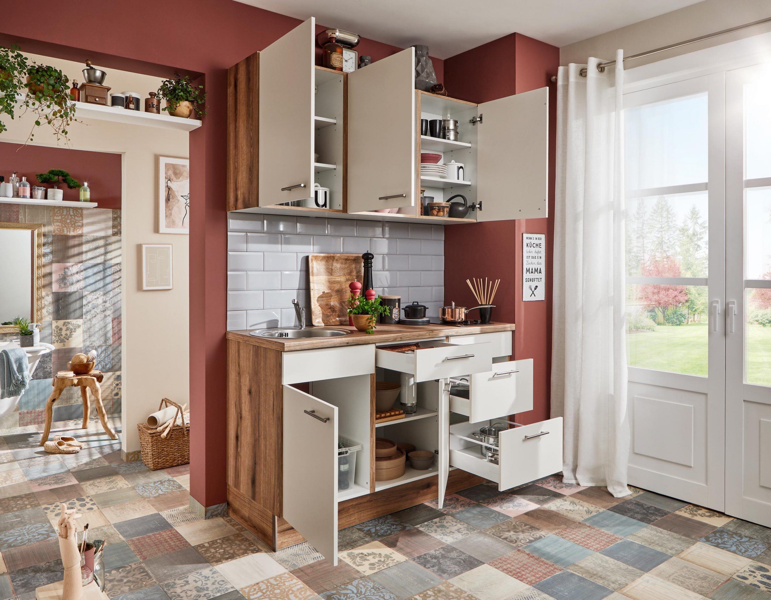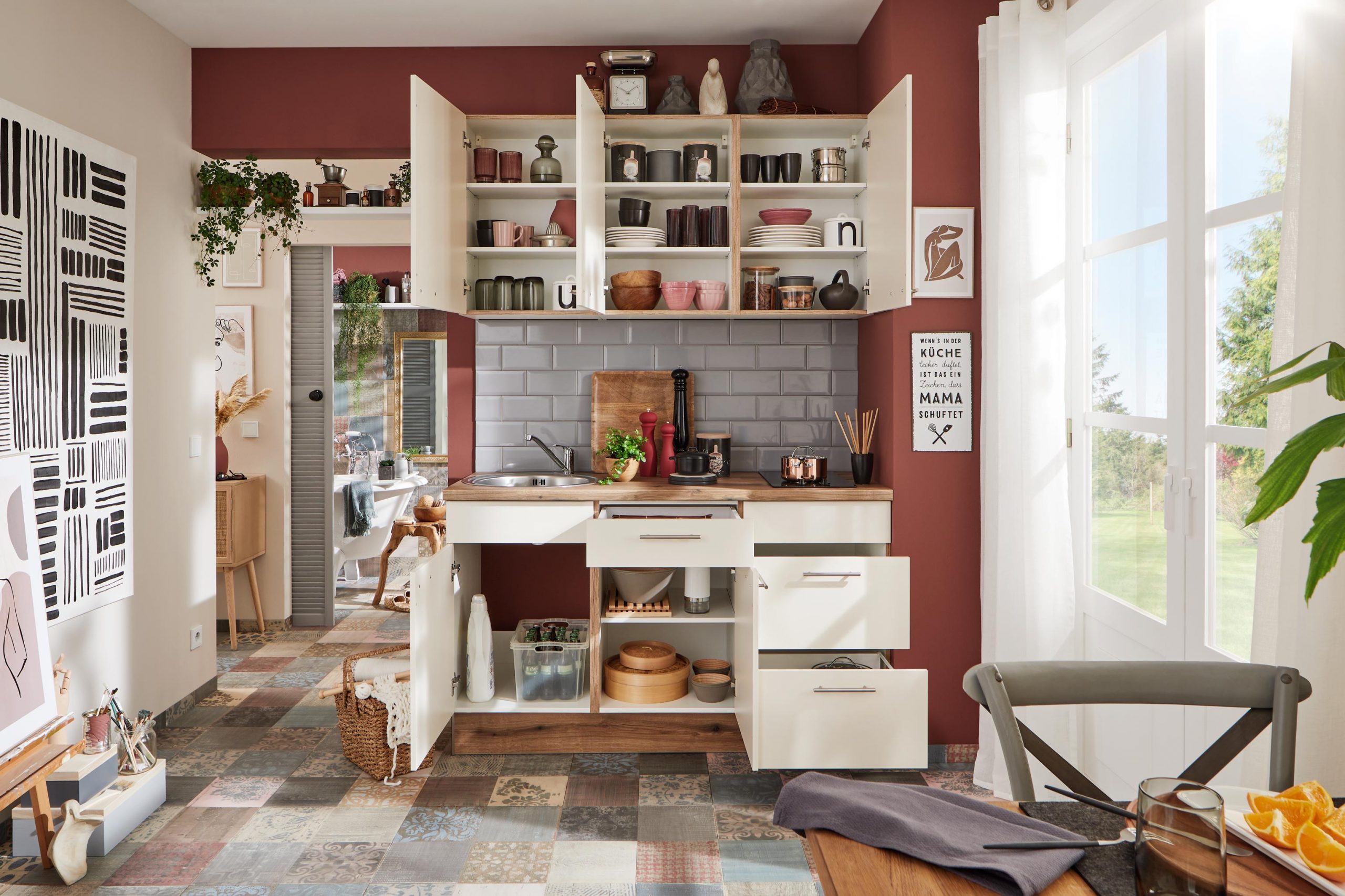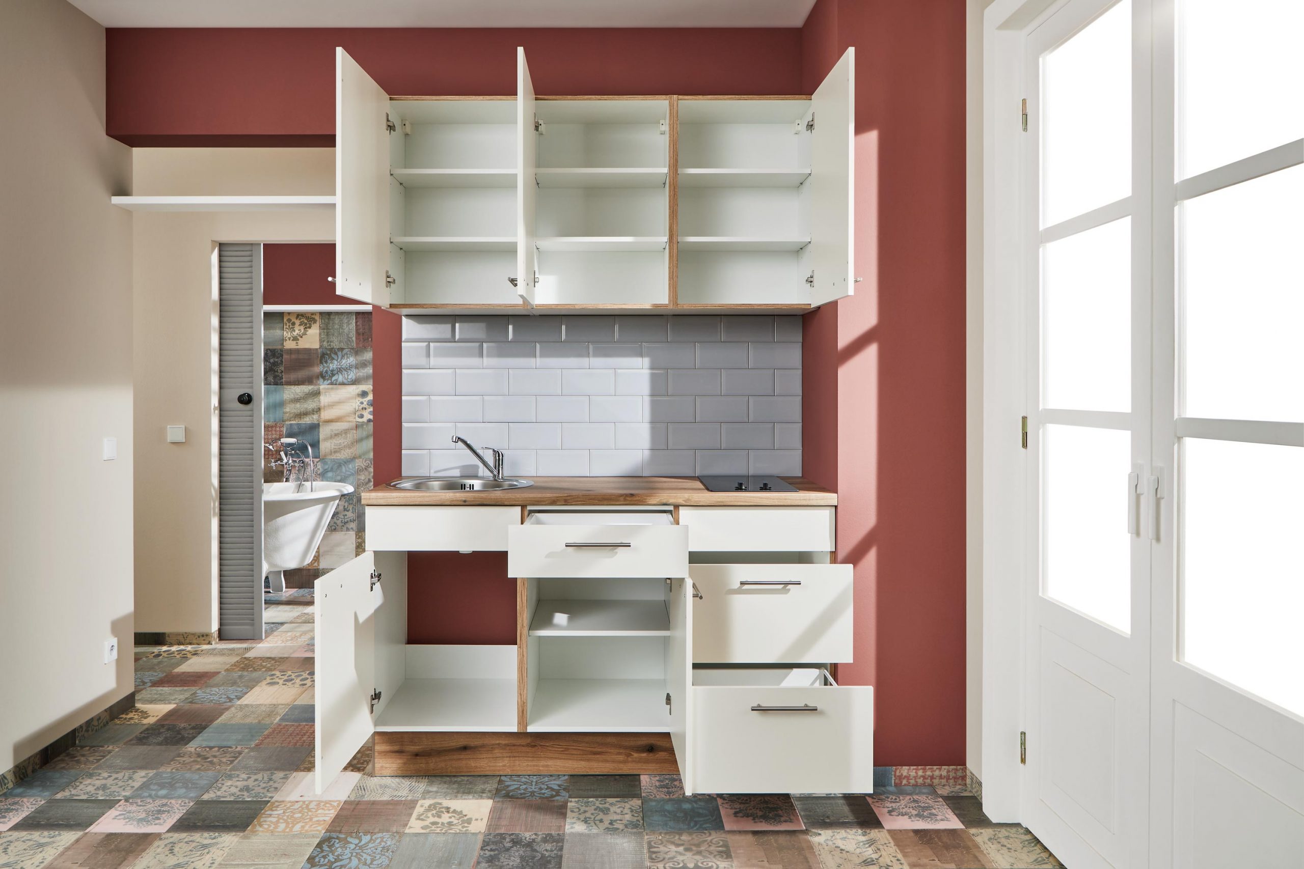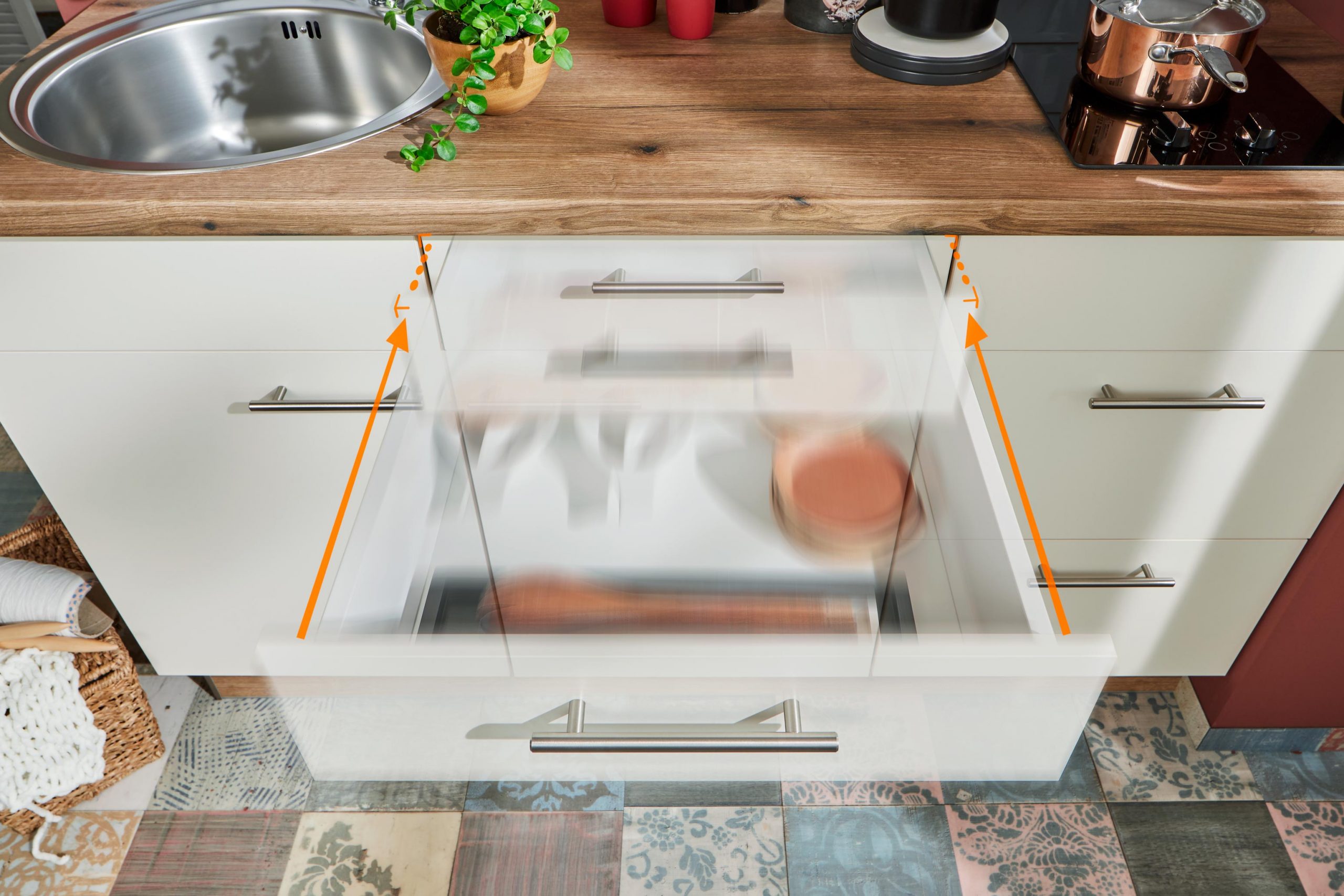 Made in Germany, hochwertig kratz- und abriebfest, Fronten und Korpus beidseitig melaminbeschichtet, besonders hohe Belastbarkeit der Sichtkanten Besonders stabile Qualitäts-Beschläge von Blum, praktischer Vollauszug, geräuscharmer Lauf mit Softclose-Technik; selbstschließende Türscharniere mit 107° Öffnungswinkel für den bequemen Zugang zum Stauraum