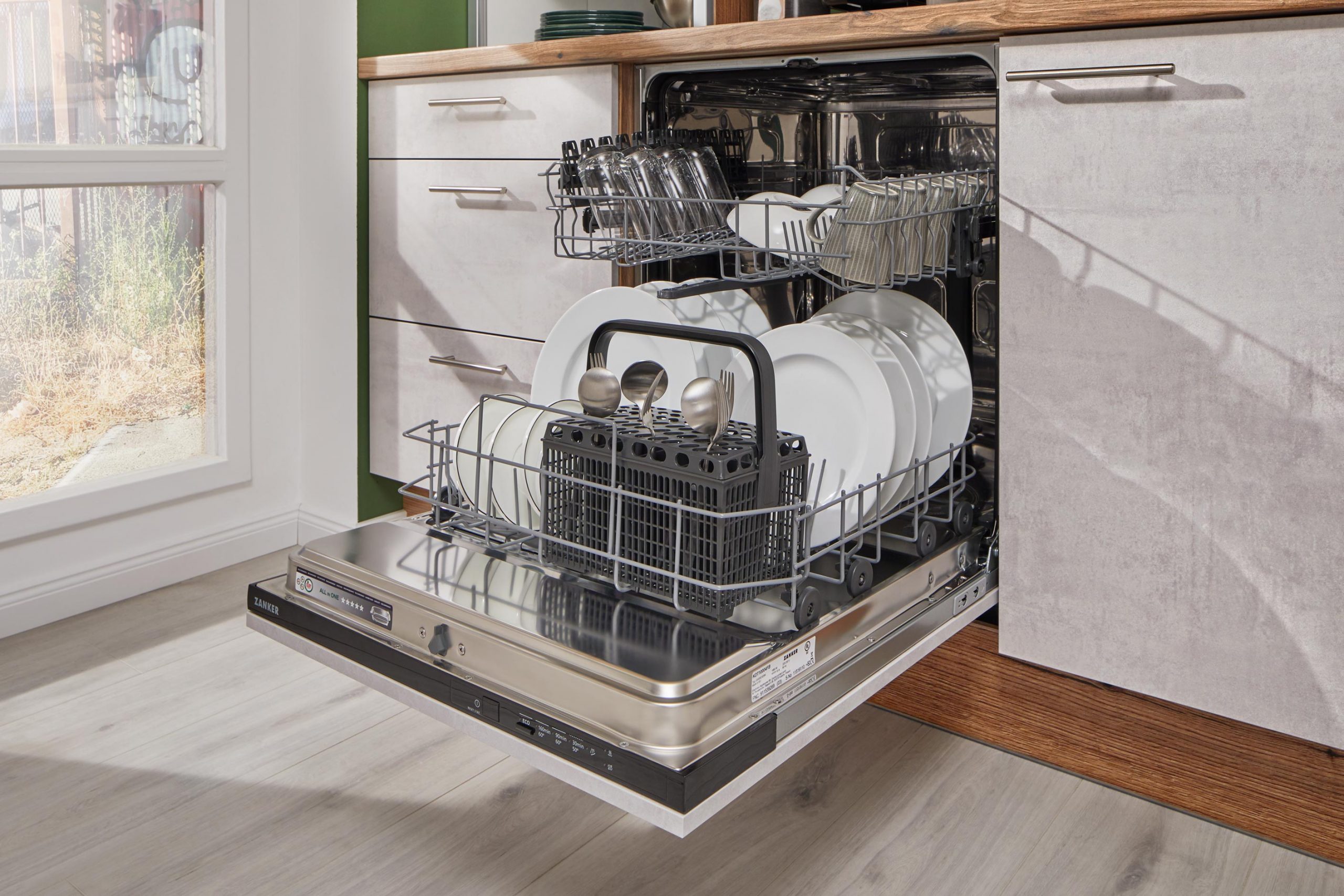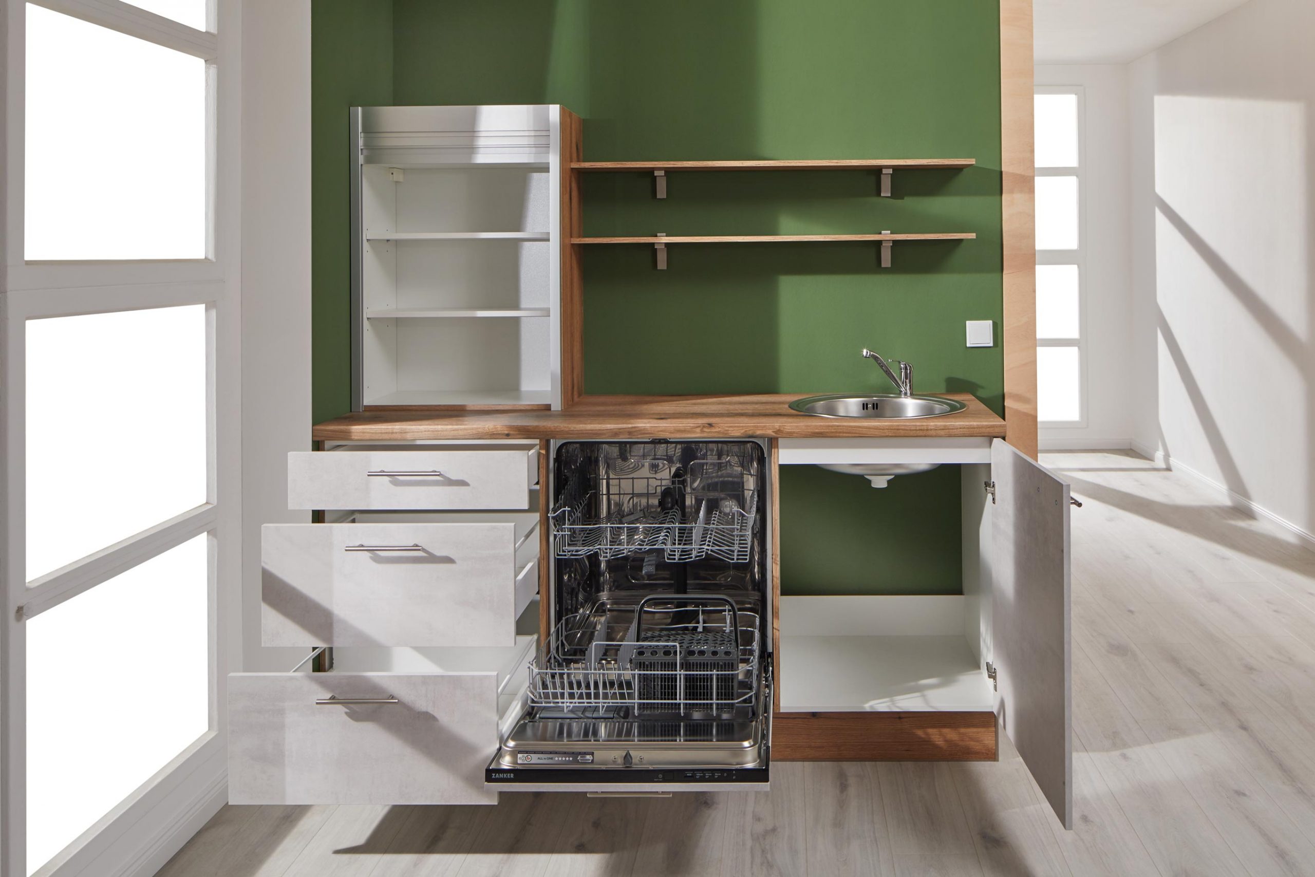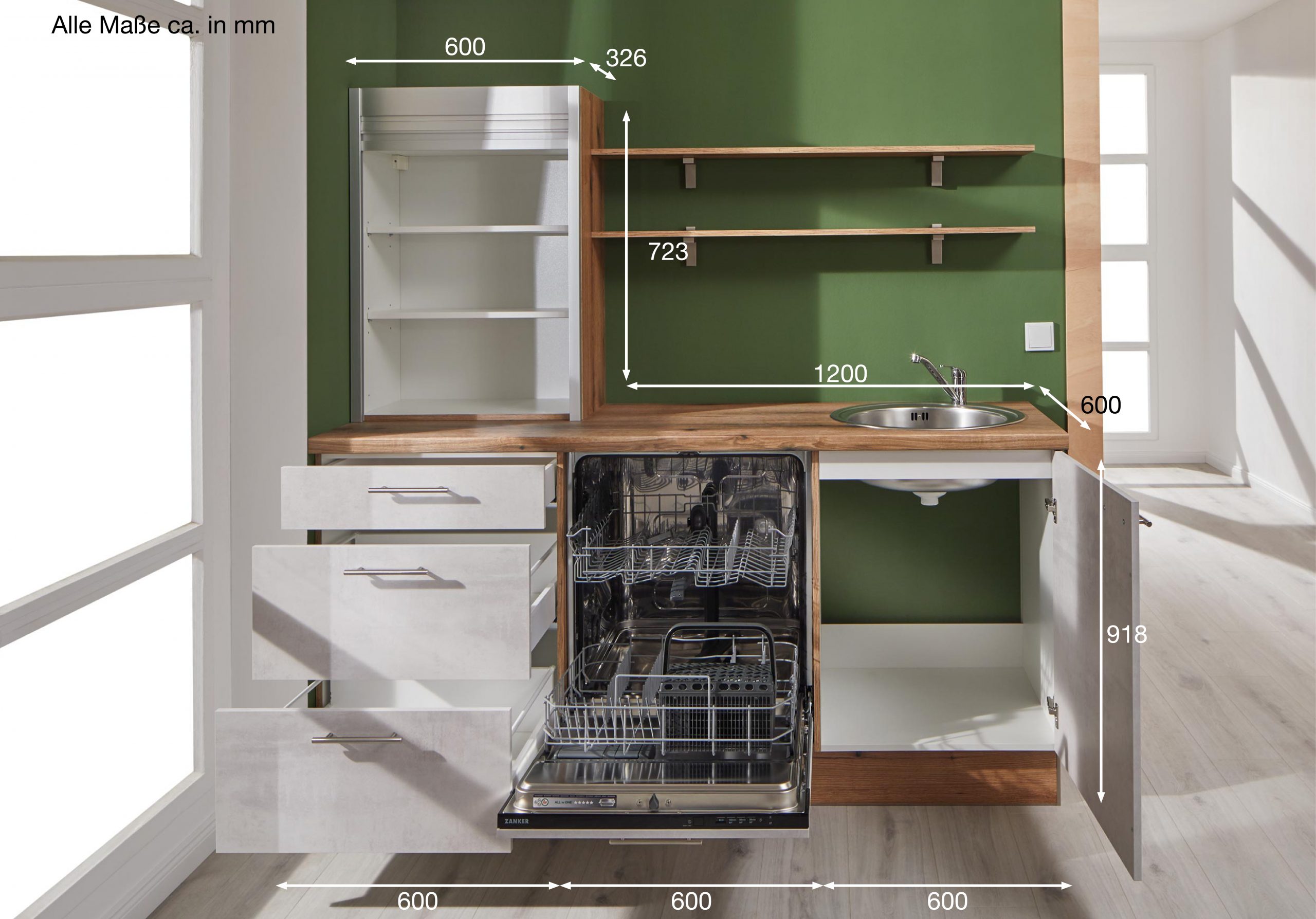 Zanker-Einbaugeräte: Kühlschrank, Glaskeramik-Kochfeld, Spüle + Armatur, Arbeitsplattenausschnitte für Spüle und Kochfeld