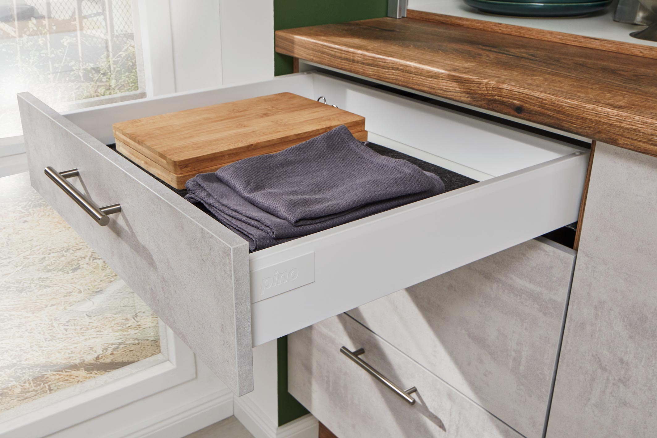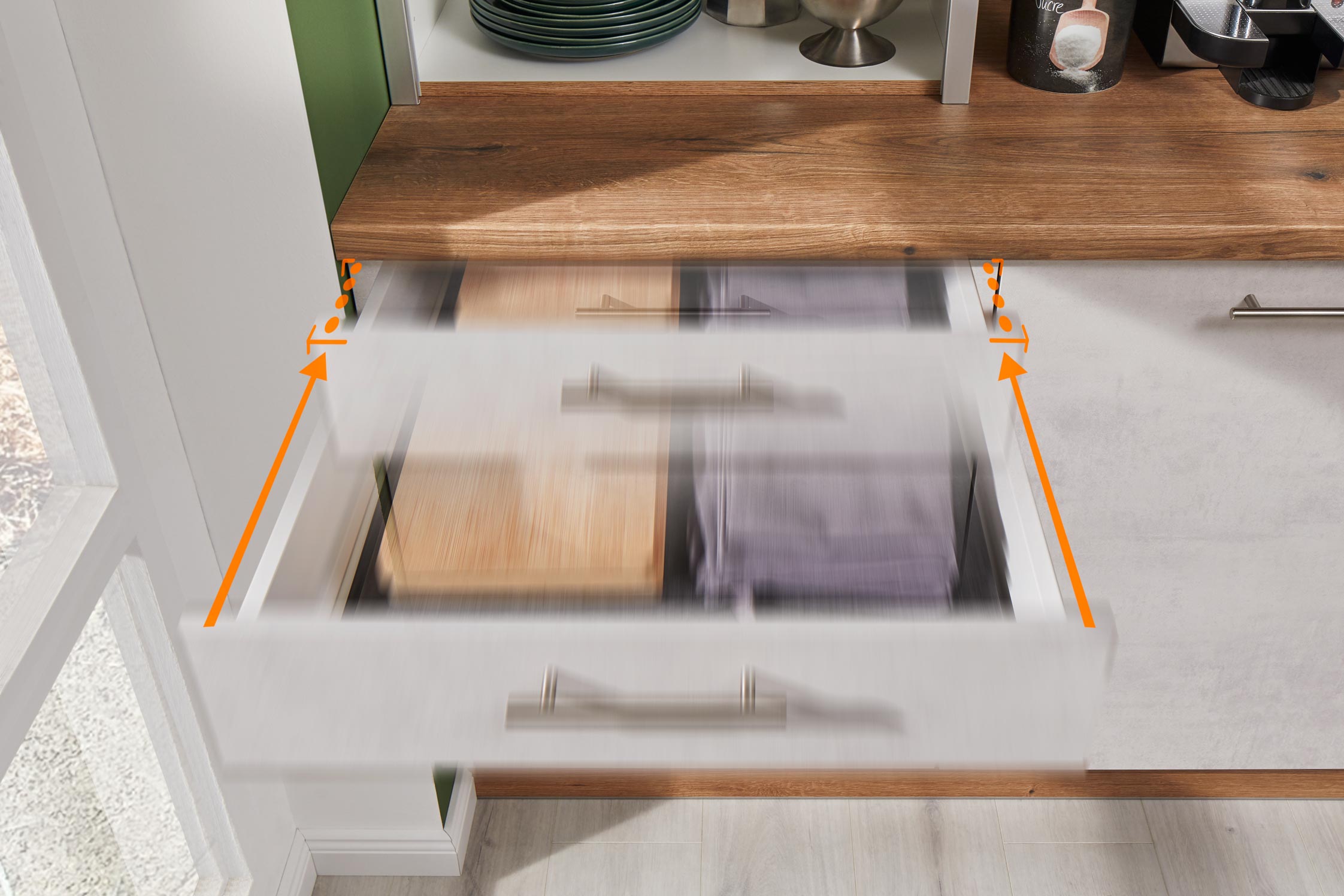 Made in Germany, hochwertig kratz- und abriebfest, Fronten und Korpus beidseitig melaminbeschichtet, besonders hohe Belastbarkeit der Sichtkanten Besonders stabile Qualitäts-Beschläge von Blum, praktischer Vollauszug, geräuscharmer Lauf mit Softclose-Technik; selbstschließende Türscharniere mit 107° Öffnungswinkel für den bequemen Zugang zum Stauraum
