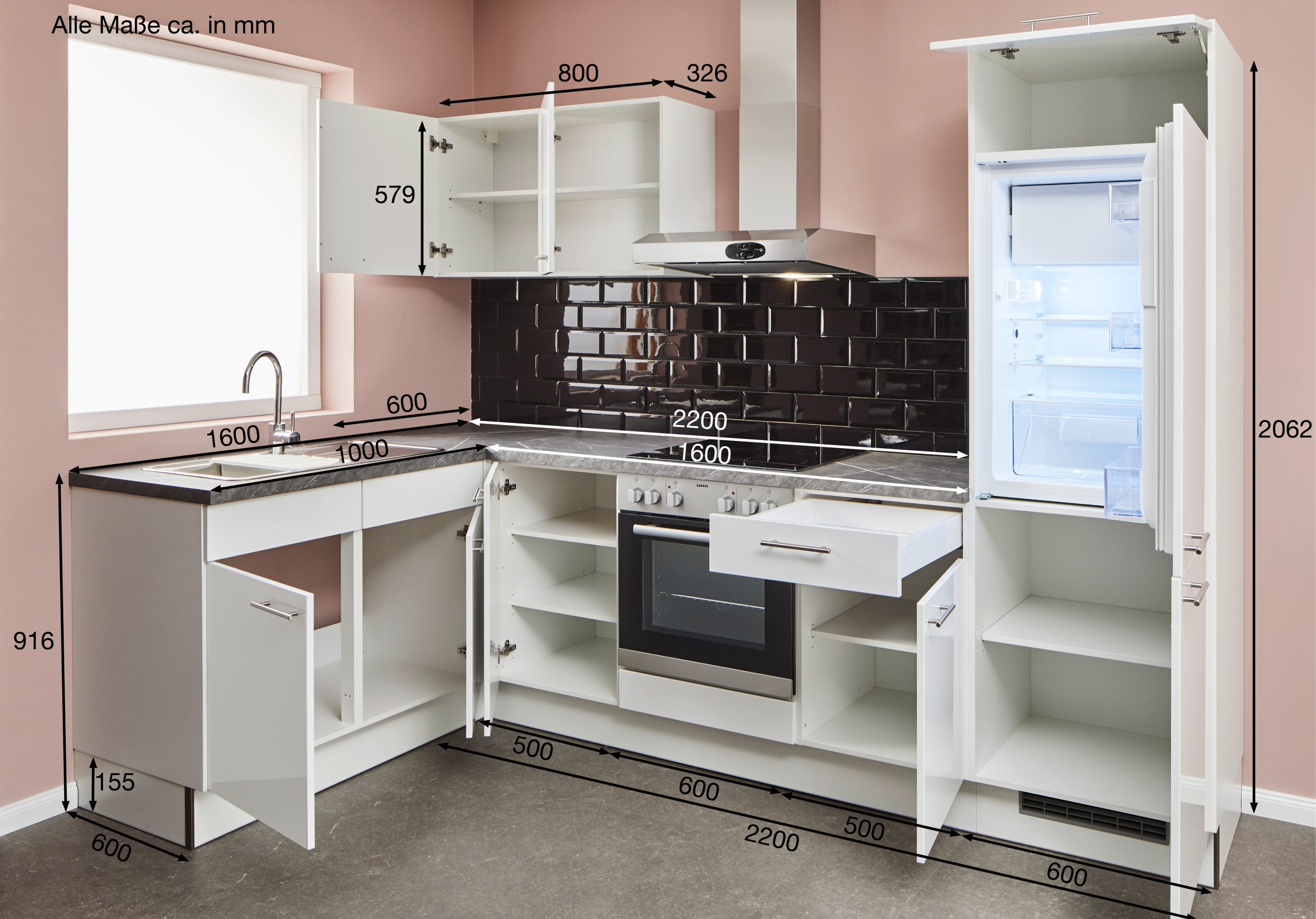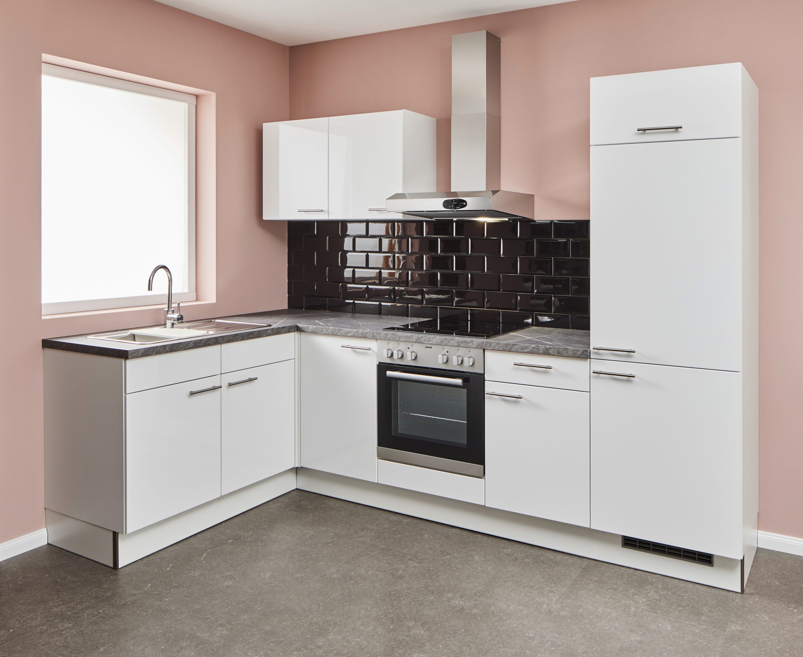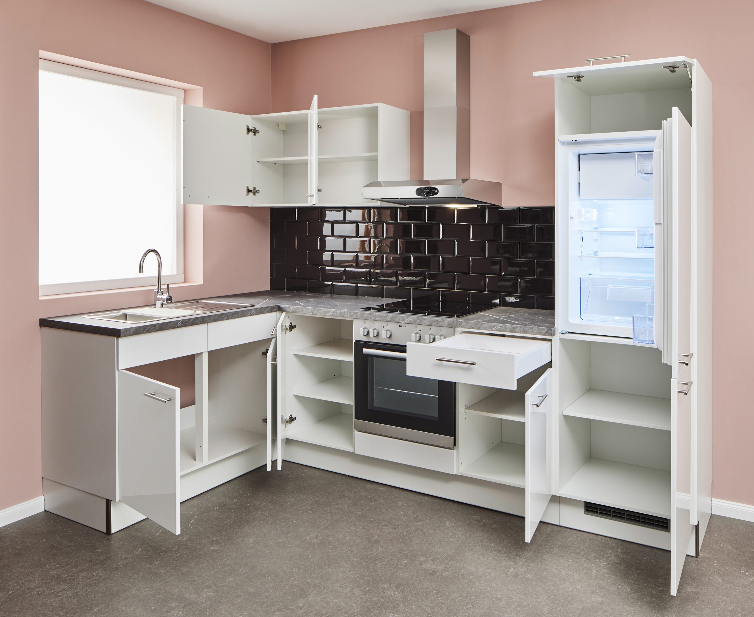 Zanker-Einbaugeräte: Kühlschrank, Glaskeramik-Kochfeld, Spüle + Armatur, Arbeitsplattenausschnitte für Spüle und Kochfeld