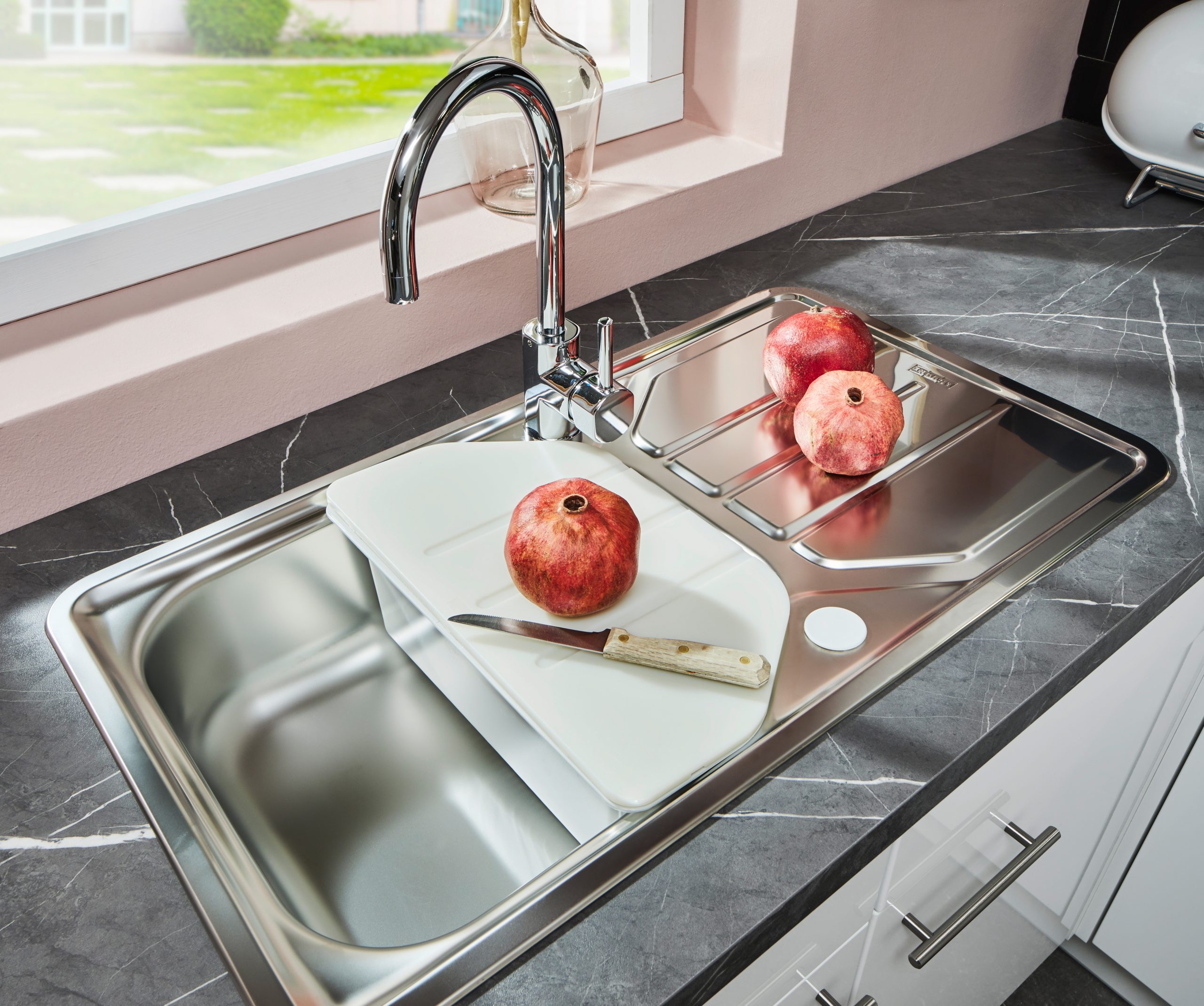 Made in Germany, hochwertig kratz- und abriebfest, Fronten und Korpus beidseitig melaminbeschichtet, besonders hohe Belastbarkeit der Sichtkanten Besonders stabile Qualitäts-Beschläge von Blum, praktischer Vollauszug, geräuscharmer Lauf mit Softclose-Technik; selbstschließende Türscharniere mit 107° Öffnungswinkel für den bequemen Zugang zum Stauraum