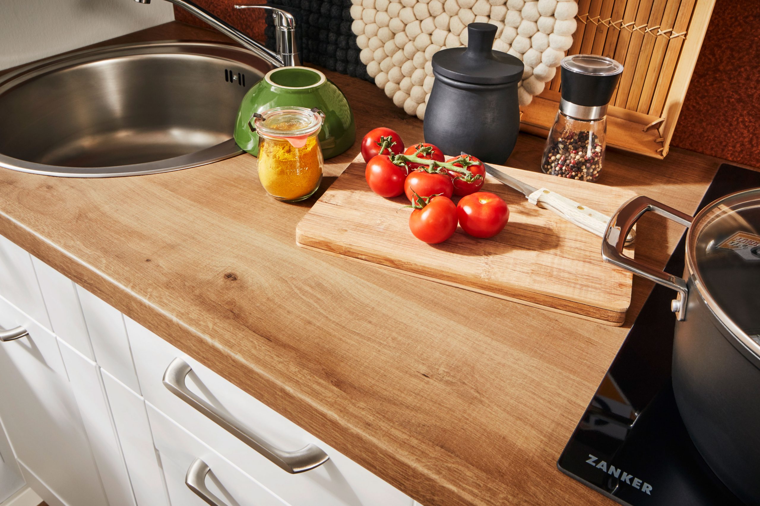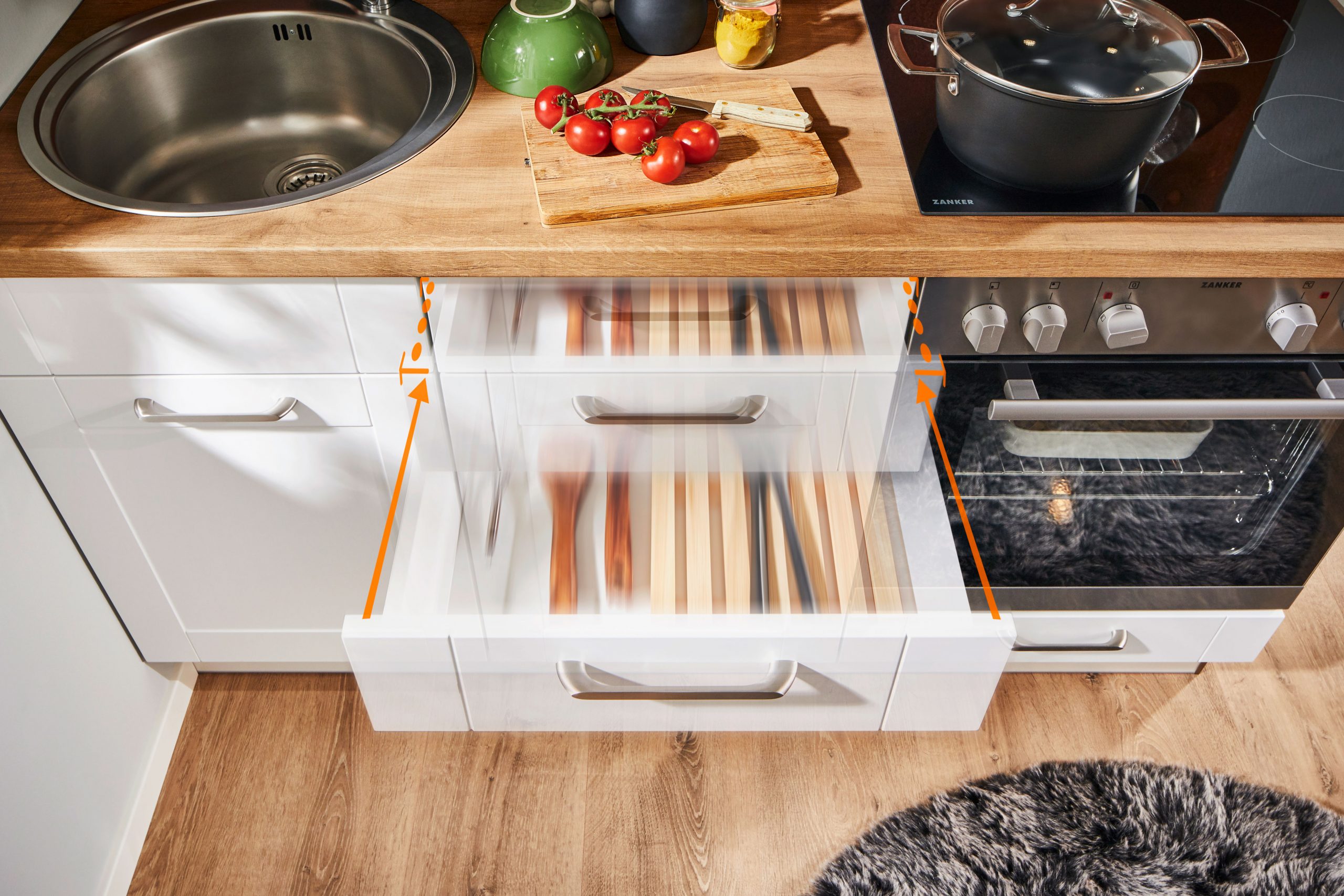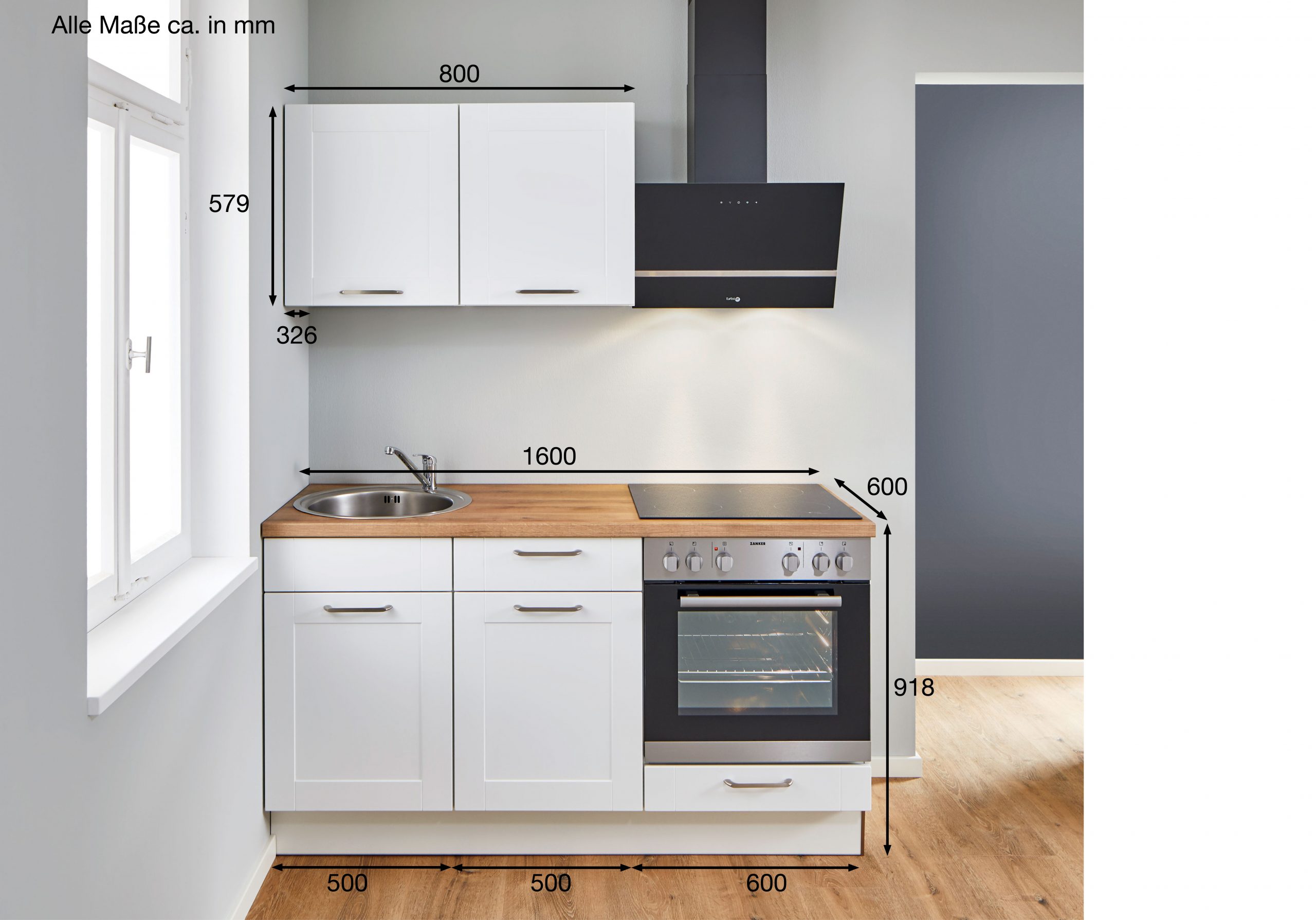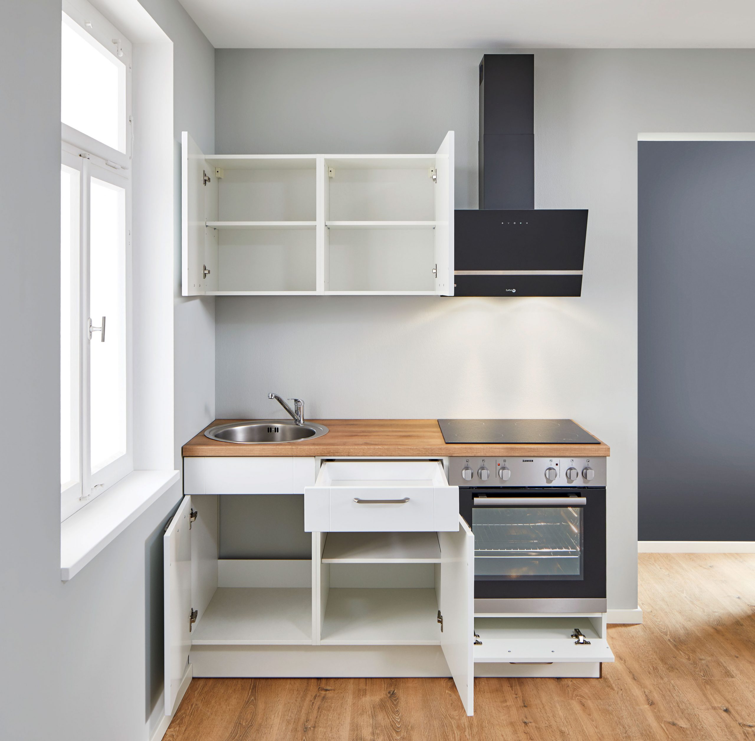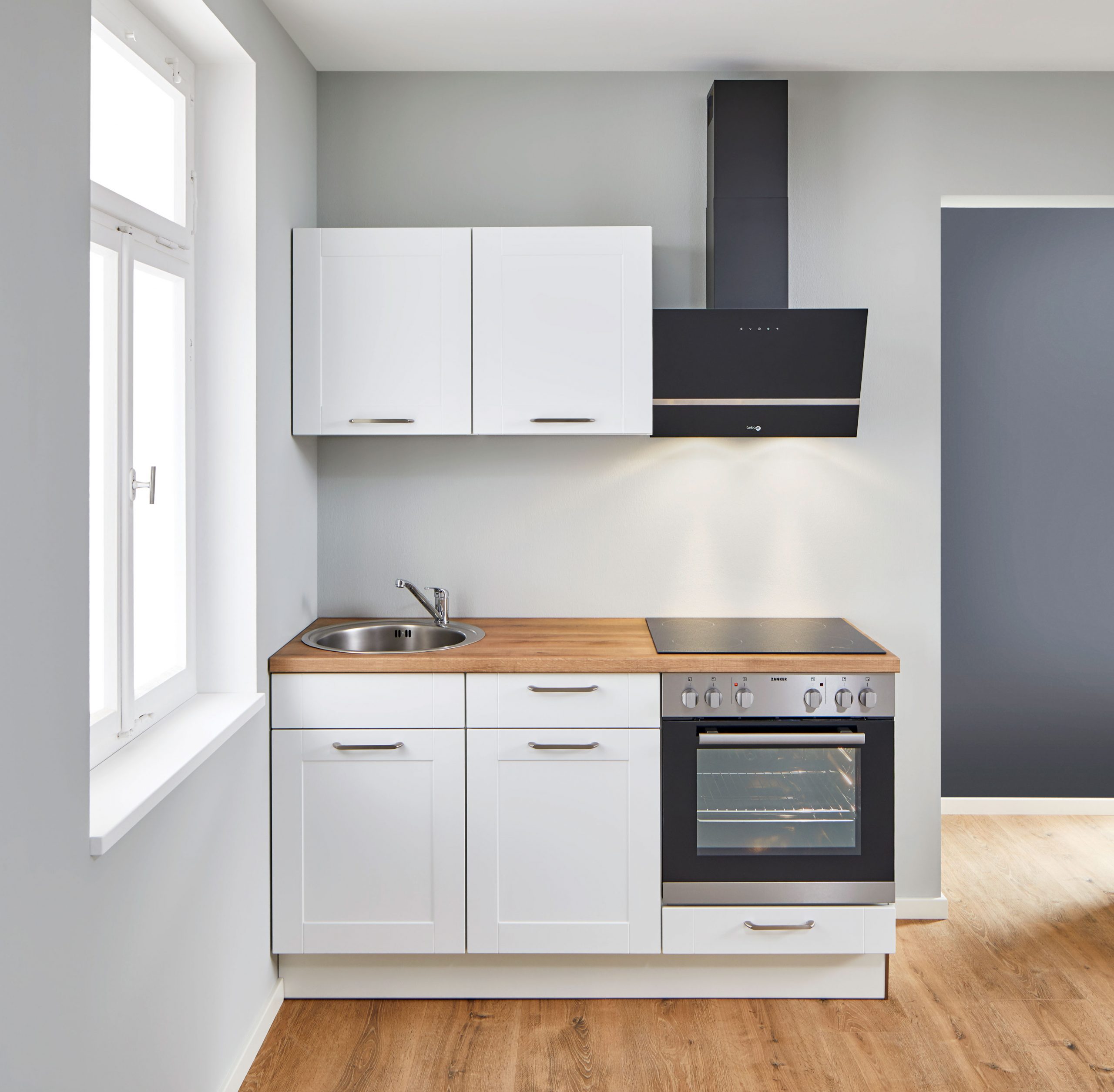 Zanker-Einbaugeräte: Kühlschrank, Glaskeramik-Kochfeld, Spüle + Armatur, Arbeitsplattenausschnitte für Spüle und Kochfeld.