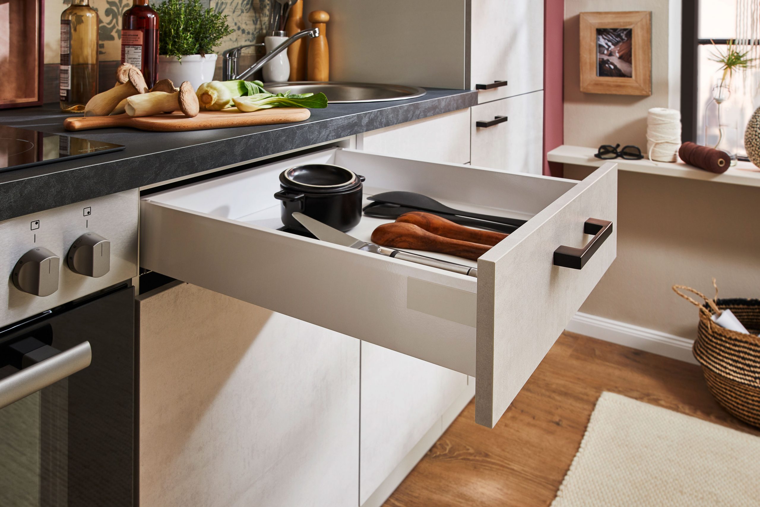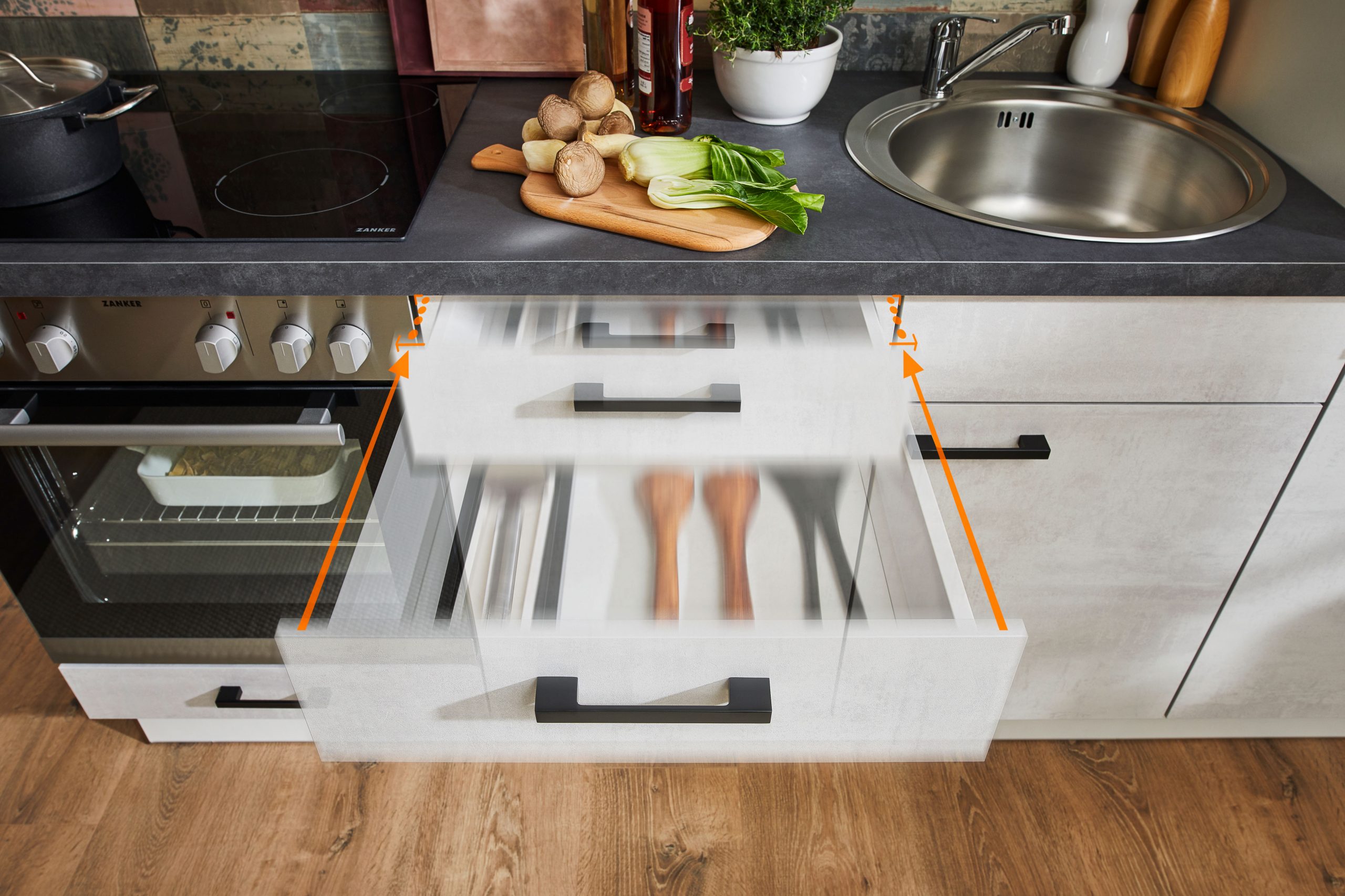 Made in Germany, hochwertig kratz- und abriebfest, Fronten und Korpus beidseitig melaminbeschichtet, besonders hohe Belastbarkeit der Sichtkanten Besonders stabile Qualitäts-Beschläge von Blum, praktischer Vollauszug, geräuscharmer Lauf mit Softclose-Technik; selbstschließende Türscharniere mit 107° Öffnungswinkel für den bequemen Zugang zum Stauraum